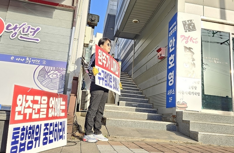 [완주독립신문]이서면에 사는 김연순 씨가 오늘 오전 8시부터 한시간 가량 안호영 국회의원 사무실 앞에서 완주·전주 통합 추진을 선언한 안호영 의원을 규탄하는 1인 시위를 펼쳤다. 이날은 안호영 국회의원 출판기념회 준비를 위해 완주군의원과 더불어민주당 읍·면협의회장 간담회가 있었다.