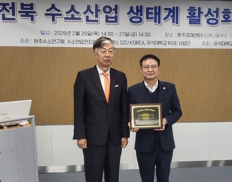 시상식은 완주경제센터에서 열린 ‘전북 수소산업 생태계 활성화 워크숍’ 현장에서 열렸다. 김 부의장은 완주군의 수소 특화 국가산업단지 유치 추진, 수소 산업 관련 조례 제정, 거버넌스 체계 구축 등에 앞장서 지역 수소 생태계 기반 조성에 기여한 점이 평가됐다.