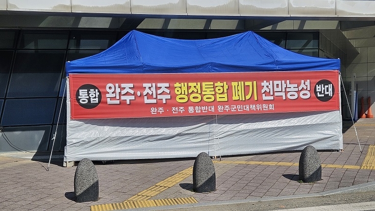 [완주독립신문]완주전주통합반대대책위원회가 최근 완주군의회 앞에 천막을 치고 농성에 들어갔다. 통반위는 "오는 6월말까지 통합을 반대하는 완주군의회와 함께 하기 위해 이같은 행동에 나섰다"고 밝혔다.