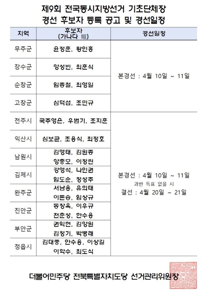 한편, 전북 기초단체장 중 무주, 장수, 순창, 고창은 후보가 두명으로 본경선만 치러질 예정이다.