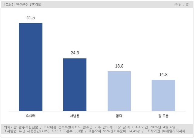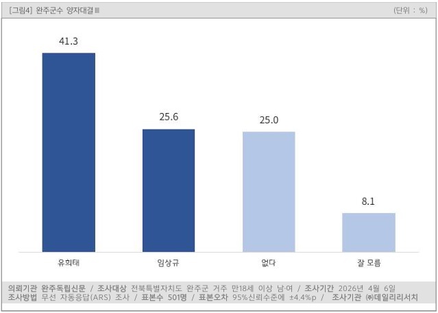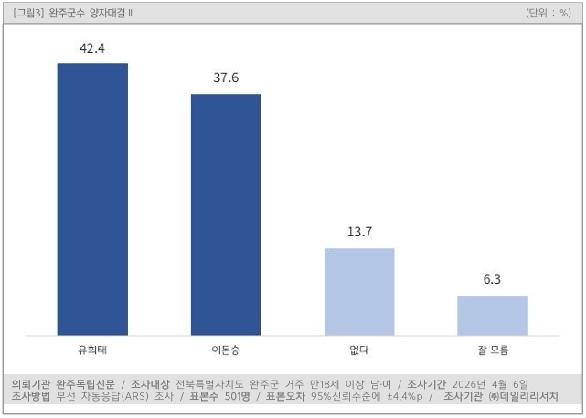 한편, 이번 조사는 ‘완주독립신문’ 의뢰로 ㈜데일리리서치에서 6일 하루동안 완주군에 거주하는 만 18세이상 남녀 501명을 대상으로 실시했다. 조사방법은 무선ARS전화조사, 피조사자 선정방법은 통신사제공 휴대전화가상번호 100%이며, 최종 응답률은 11.9%, 표본오차는 95% 신뢰수준에서 ±4.4%p이다. 2026년 3월 행정안전부 주민등록 인구통계 기준 성별,연령별,지역별 가중값 부여(셀가중)했으며, 자세한 조사개요와 결과는 중앙선거여론조사심의위원회 홈페이지를 참고하면 된다.