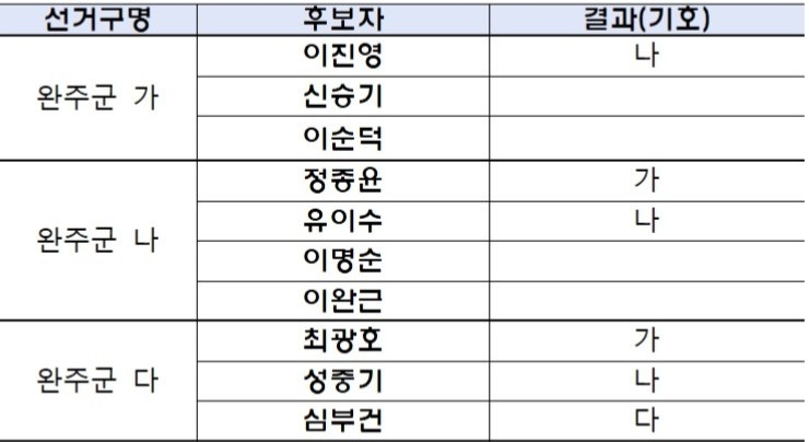 발표결과에 따르면 삼례·이서에서 기호 나에 이진영, 구이·소양·상관에 기호 가 정종윤, 기호 나 유이수, 봉동·용진에 기호 가 최광호, 기호 나 성중기, 기호 다 심부건이 결정됐다.